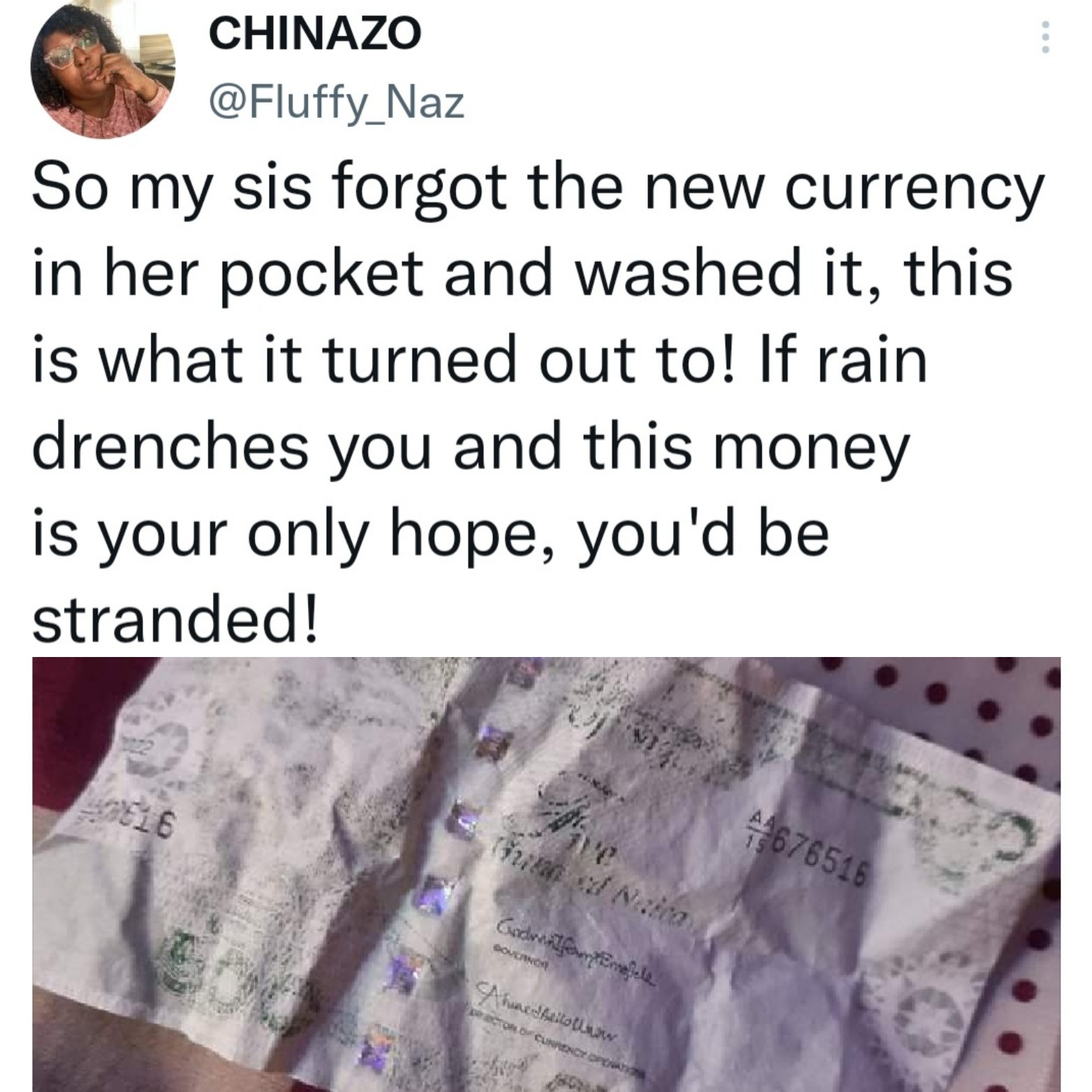 A woman has shown what became of the new Naira note after it was washed by mistake. She explained that her sister forgot it in her pocket and washed it. The 500 Naira note faded when it eventually dried. "If rain drenches you and this money is your only hope, you'd be stranded," she wrote.