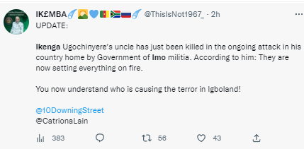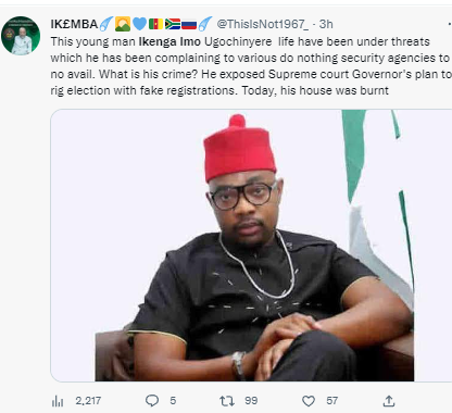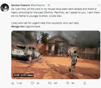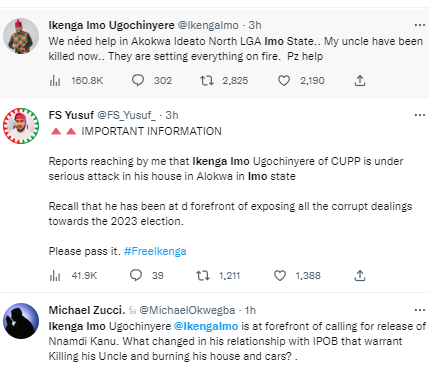 Gunmen have attacked the Spokesperson of the Coalition of United Political Parties (CUPP), Ikenga Imo Ugochinyere, in his country home of Akokwa, Ideato North local government area of Imo State. The attack happened on Saturday afternoon, Jan. 14. Ugochinyere’s uncle, Ikeagwuonu, has been shot dead and several others fatally wounded in the attack. Ugochinyere shared a distressed tweet on Saturday afternoon, asking for help. He tweeted: "We need help in Akokwa Ideato North LGA Imo State.. My uncle have been killed now.. They are setting everything on fire. Pz help."