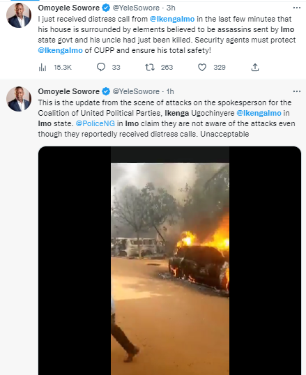 "Nigerians and international community are to recall that on December 23, 2022, there was an attack on the convoy of our candidate by clearly-identified agents of the Imo State Government. It is shocking that despite our demand for the arrest and prosecution of those involved in that onslaught, nothing has been done by the security till this moment. "Today represents a dark day for us in Imo PDP and Imo State at large." Watch videos from the scene below. As I pen this, all the cars in my house have been sent ablaze and there is heavy shooting for the past 25mins. Painfully, as I speak to you, I saw them kill my father's younger brother, Uncle Dan.I pray and call for urgent help from anybody who can help.Ikenga Imo Ugochinyere pic.twitter.com/zQlvaaoiF9— Ijeoma Osamor (@IjeOsamor) January 14, 2023 This is the update from the scene of attacks on the spokesperson for the Coalition of United Political Parties, Ikenga Ugochinyere @IkengaImo in Imo state. @PoliceNG in Imo claim they are not aware of the attacks even though they reportedly received distress calls. Unacceptable pic.twitter.com/MGMIcwHlUF— Omoyele Sowore (@YeleSowore) January 14, 2023 The post Many killed as gunmen attack CUPP spokesperson Ikenga Imo Ugochinyere’s residence in Imo (videos) appeared first on Linda Ikeji Blog. Click Here to Visit Orignal Source of Article http://www.lindaikejisblog.com/2023/1/many-killed-as-gunmen-attack-cupp-spokesperson-ikenga-imo-ugochinyeres-residence-in-imo-videos.html