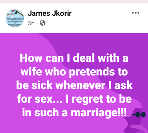 A Kenyan man, James Jkorir, has said that he regrets marrying his wife because she always pretends to be sick whenever he wants to have sex with her. "How can I deal with a wife who pretends to be sick whenever I ask for sex… I regret to be in such a marriage!!!," he lamented on a Christian Facebook group on Wednesday, January 18, 2023. See his post and replies below…