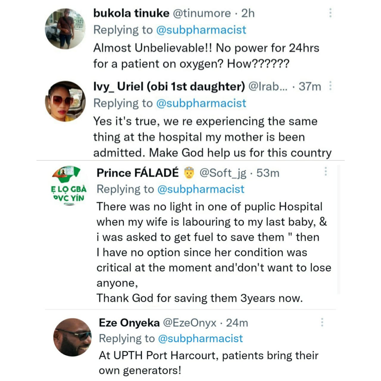 A Nigerian pharmacist on Twitter has shared the sad story of how his colleague who was on life support passed on after the hospital suffered a power outage for more than 24 hours. The pharmacist with the handle @subpharmacist said the deceased was involved in an accident and had a blood clot in his braid. He said the deceased was placed on oxygen but died due to the prolonged loss of electricity supply. Read the story below…