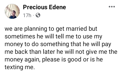 A Nigerian lady, Precious Edene wants to know if her fiancé is putting her through a ''test'' as he doesn't give her money to do things, and instead, asks her to use her money. "We are planning to get married but sometimes he will tell me to use my money to do something that he will pay me back than later he will not give me the money again, please he is good or is he testing me." she wrote on Facebook.  The post He tells me to buy things with my money but won’t me pay back – Nigerian lady wants to know if her fianc is ‘testing’ her appeared first on Linda Ikeji Blog. Click Here to Visit Orignal Source of Article http://www.lindaikejisblog.com/2023/1/he-tells-me-to-buy-things-with-my-money-but-wont-me-pay-back-nigerian-lady-wants-to-know-if-her-fiance-is-testing-her.html