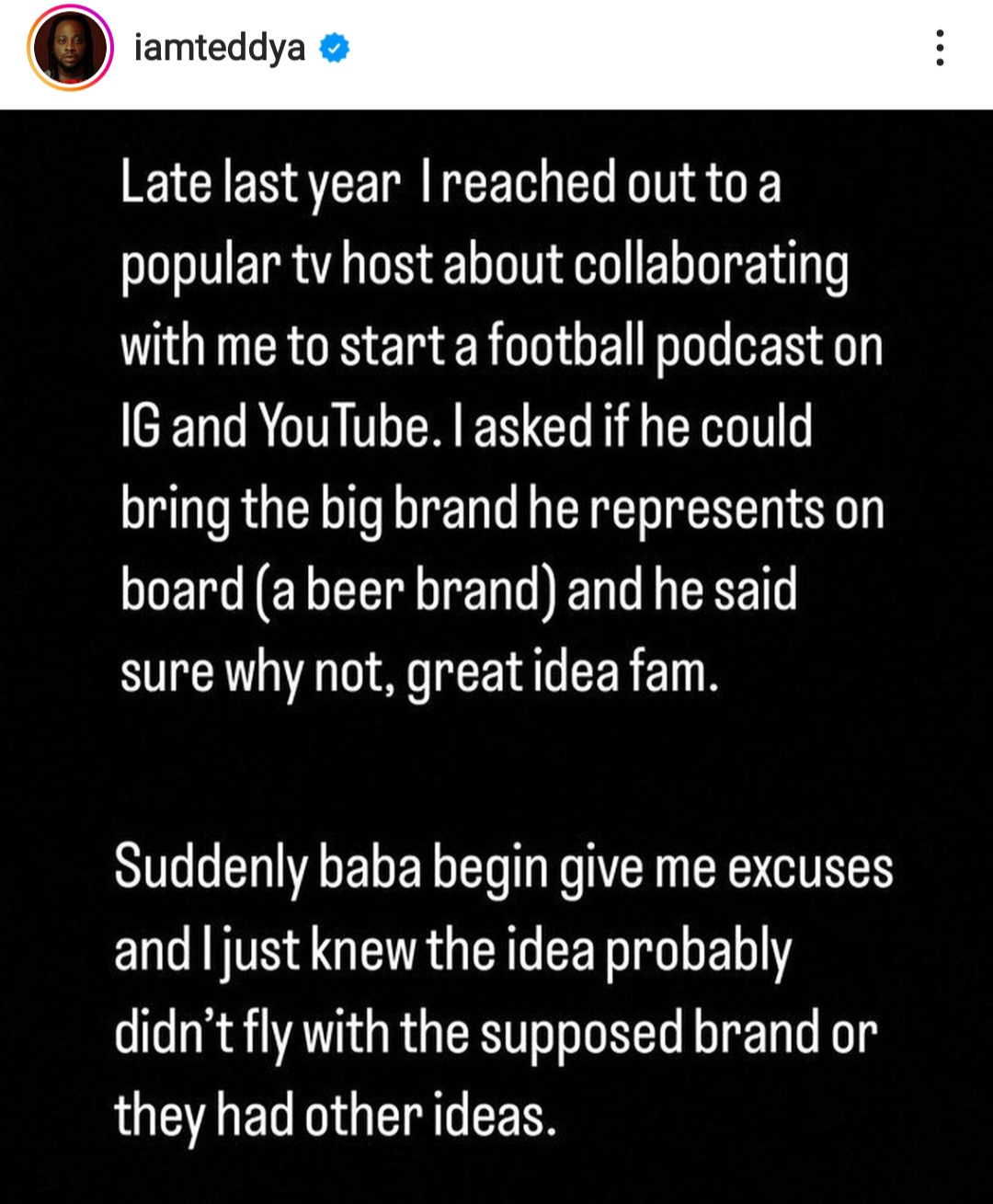 Teddy A has disclosed that his idea for a show was stolen by a popular TV host. The former Big Brother Naija reality star said he reached out to the TV host sometime last year with the idea and asked if he could bring a big brand on board. He explained that the host later began giving him excuses so he assumed the brand didn’t like the idea. However, he said he recently came across the media personality hosting the same show he thought up and it was sponsored by the same brand that he suggested. See the reality star’s post below.