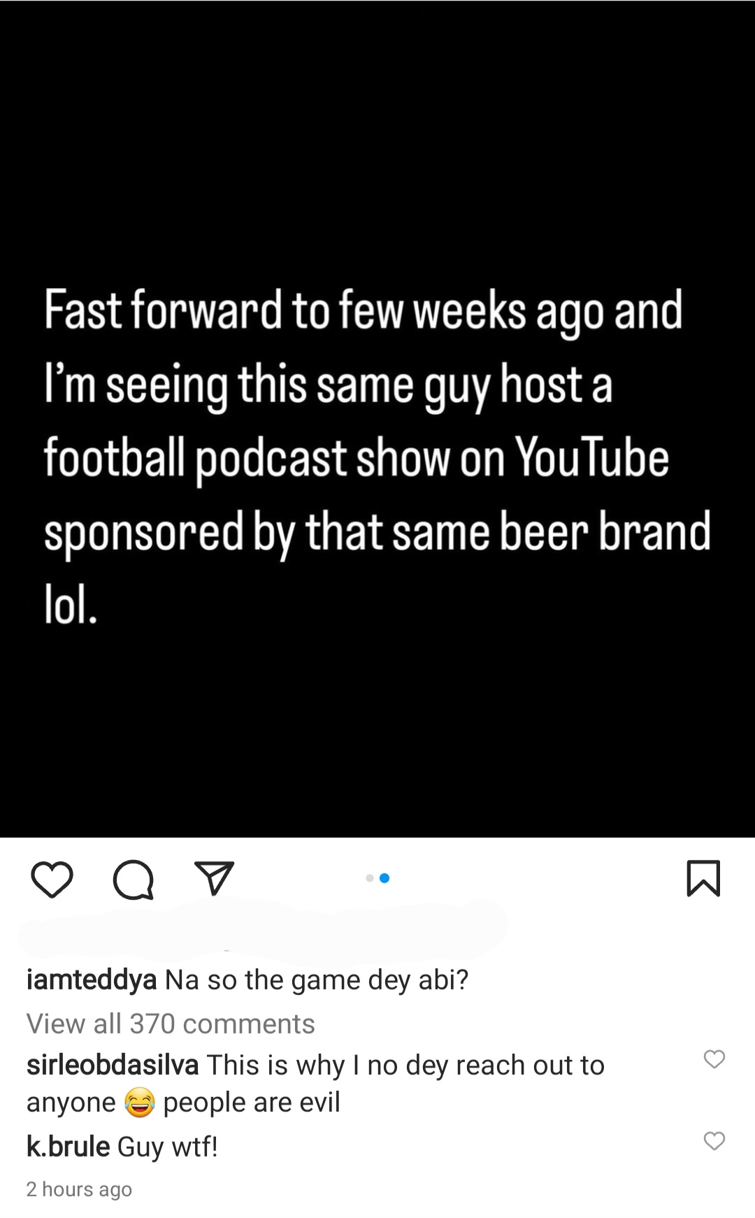 Teddy A has disclosed that his idea for a show was stolen by a popular TV host. The former Big Brother Naija reality star said he reached out to the TV host sometime last year with the idea and asked if he could bring a big brand on board. He explained that the host later began giving him excuses so he assumed the brand didn’t like the idea. However, he said he recently came across the media personality hosting the same show he thought up and it was sponsored by the same brand that he suggested. See the reality star’s post below.