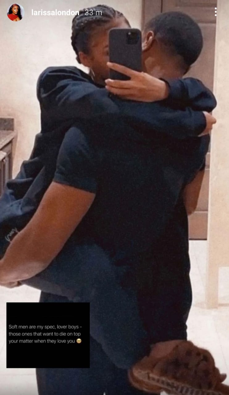 Larissa London who shares a son, Dawson, with singer, Davido, has revealed the kind of men she fancies. Larissa shared a post on her Instatories this morning. The UK-based makeup artist shared a photo of a woman being carried by a man and wrote Soft men are my spec. lover boys – those ones that want to die on top your matter when they love you”Recall that Davido took a while before acknowledging Dawson as his son. See Larissa’s post below..