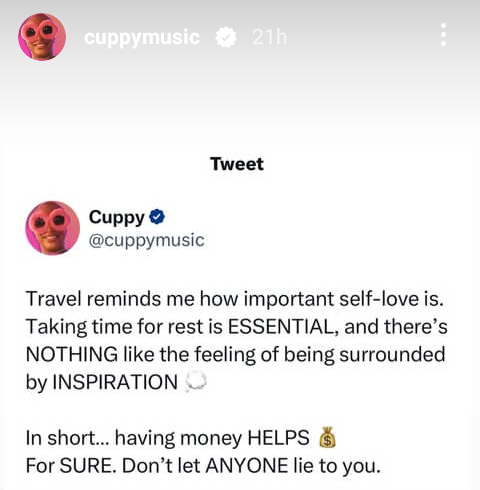 Nigerian disc jockey, Florence Otedola, aka DJ Cuppy, has said that money is very important. The daughter of billionaire businessman, Femi Otedola, who is currently in the Maldives, stated this at the weekend. Travel reminds me how important self-love is. Taking time for rest is essential, and there’s nothing like the feeling of being surrounded by inspiration, she wrote. In short.having money helps for sure. Don’t let anyone lie to you.