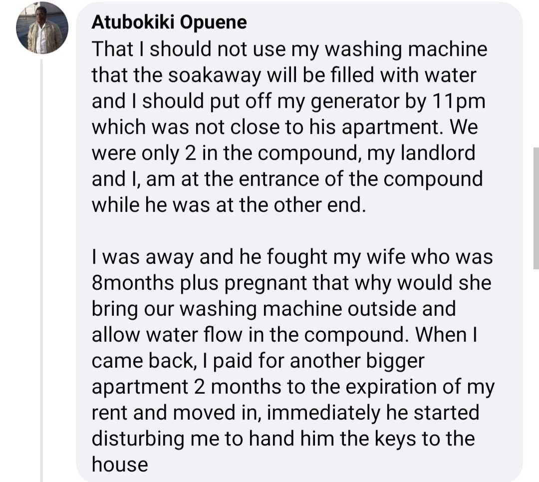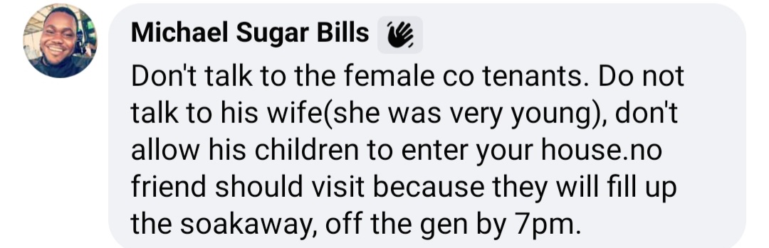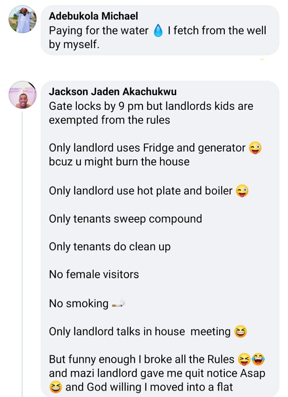 Nigerians have taken to social media to reveal some of the weird rules their landlords gave them when they moved in as tenants. They shared the many reasons while responding to a question posed by a Facebook user, Justina Ndubuisi. Many revealed that their landlords instructed them never to turn on their generators beyond 9pm. Some said their landlords banned them from carrying out laundry in their bathrooms so they do not fill up the soakaway with water. Some Nigerians mentioned that their landlords banned them from having visitors spend the night in their homes. One person mentioned that his landlord instructed them to always participate in an all-night vigil that holds every last Friday of the month. One mentioned that the landlord warned against masturbating in his property. Read the various accounts below