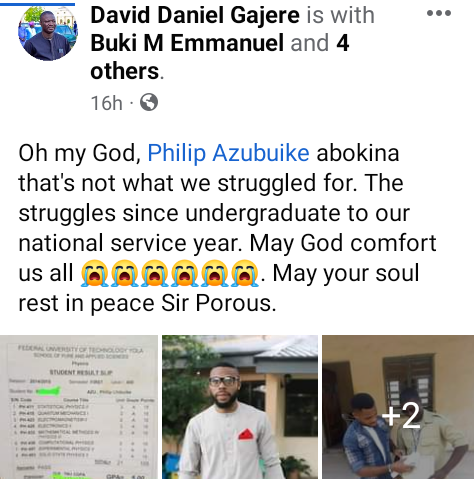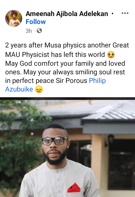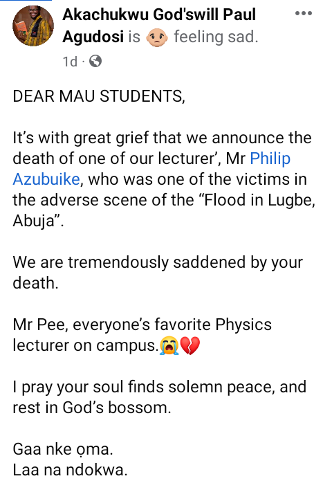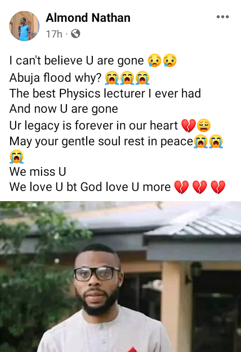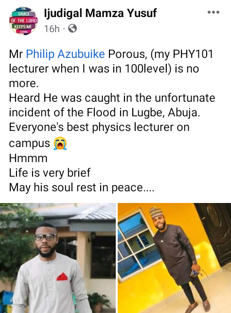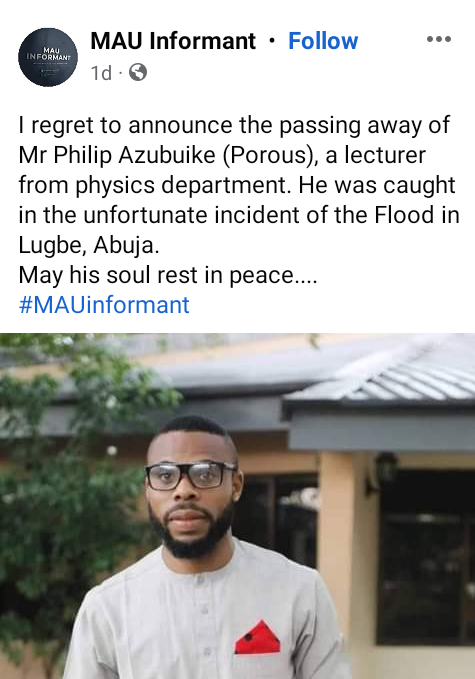 A university lecturer, Philip Azubuike, has been confirmed dead after he was swept away by the flood that occurred at Trademore Estate in Lugbe area of Abuja on Friday June 23. Azubuike, until his death, was a lecturer with the Physics Department in Modibbo Adama University of Technology, Yola, Adamawa State. It was gathered that he was swept away in his Peugeot 406 car with registration No. YLA 681 FS. His corpse was recovered from the canal by the entrance of the estate. Alhaji Ashiru, an inspector of police newly posted to the area, who narrated how he lost all his properties, said he pulled out the corpse from the canal with the help of other residents around. Several residents said they saw the victim struggling to come out of the Peugeot car when the flood started. We saw him on the top of his vehicle trying to avoid the flood, but later we did not see him again, a motorcyclist told Premium Times after the corpse was pulled out. Meanwhile, friends, colleagues and former students have taken to Facebook to mourn the young lecturer. “DEAR MAU STUDENTS. Its with great grief that we announce the death of one of our lecturer, Mr Philip Azubuike, who was one of the victims in the adverse scene of the Flood in Lugbe, Abuja. We are tremendously saddened by your death. Mr Pee, everyones favorite Physics lecturer on campus. I pray your soul finds solemn peace, and rest in Gods bossom. Gaa nke ma. Laa na ndokwa. Ruo mgbe any zute,” one Akachukuwu Agudosi, wrote.