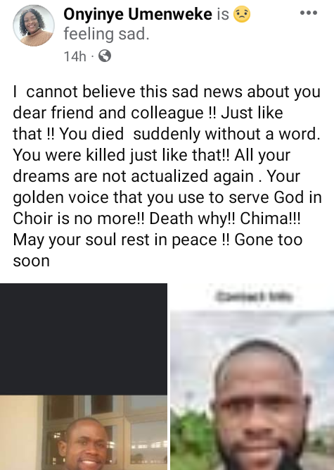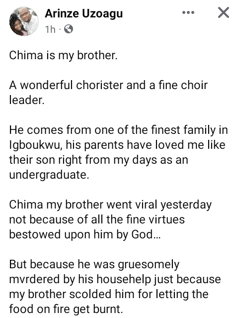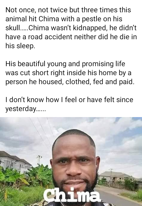 A domestic servant has allegedly killed his employer with a pestle in Awka, Anambra State capital. The deceased, Chima Anolue, a lecturer at the Psychology Department at the Nnamdi Azikiwe University, Awka, was attacked with the pestle when a fight ensued between him and the domestic servant. It was gathered that the incident happened on Friday night, July 14, 2023, at Ifite village in Awka. The suspect was also said to have bruised the deceaseds body with a knife after he became unconscious to make it look as if he was attacked by a third party, Punch reported. According to sources, the suspect was captured by the local security and confessed to repeatedly hitting his late boss with a pestle after he asked him why he hadn’t done his household duties. However, when he refused to answer, Chima slapped him, which led to a fight, where he later fatally attacked his boss. When he came back, he told me to cook rice. And as I was cooking the rice, he asked me why I did not wash plates. I did not reply. He then asked why I wasnt responding to his question, the suspect said. In the process, he slapped me. But I told him I usually have ear problems, and that people dont slap me. As I was saying that, he angrily asked if I was still talking while he was talking. And therefore, he slapped me again and brought out cane and started flogging me all over, “Then in the process, I got angry, and we started fighting. It was also in the process of that fight that I picked up the pestle in the kitchen and hit him on the head. During interrogation, the suspect who first denied killing his master, later confessed to the crime after he was thoroughly beaten when his moves became suspicious. A family source said, While friends and relatives of the deceased were taking him to the hospital that night for medical attention after the encounter, the suspect was attempting to choke him to death right inside the vehicle where he was sitting close to him allegedly to conceal his atrocious acts. It was in the process that we discovered what was going on and therefore we started suspecting him. As that was going on also, the victim who was still alive then, used his last strength to mention the suspects name, before he finally gave up the ghost,” “In his confessions, the suspect first said that it was the girlfriend of the deceased who visited him that night that attacked him. However, he eventually confessed that he was the person who killed him with a pestle. The suspect, said to be from the Abakaliki area of Ebonyi State, has since been handed over to the Nigerian Police Force, Awka division, for further questioning, while the corpse of the deceased Chima has been deposited at the morgue for autopsy. Meanwhile, friends and colleagues have taken to Facebook to mourn him. Chima was my brother. A wonderful chorister and a fine choir leader. He comes from one of the finest family in Igboukwu, his parents have loved me like their son right from my days as an undergraduate, one Arinze wrote. Chima my brother went viral yesterday not because of all the fine virtues bestowed upon him by God But because he was gruesomely mvrdered by his househelp just because my brother scolded him for letting the food on fire get burnt. Not once, not twice but three times this animal hit Chima with a pestle on his skull..Chima wasnt kidnapped, he didnt have a road accident neither did he die in his sleep. His beautiful young and promising life was cut short right inside his home by a person he housed, clothed, fed and paid. I dont know how I feel or have felt since yesterday.