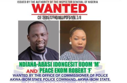 The Nigeria Police Force has declared two persons, Ndiana-Abasi Idongesit Udom and Peace Ekom Robert, pictured above, wanted. According to a Special Police Gazette, the two are wanted for Criminal conspiracy, a threat to life, and forgery. fraudulent conversion and conduct likely to cause a breach of peace. See the police bulletin below