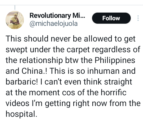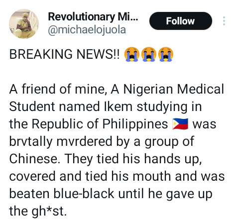 A Nigerian medical student identified simply as Ikem , was allegedly brutally murdered by a group of Chinese in the Philippines. A friend of the deceased, Michael Ojuola, disclosed this in a post via X on Sunday, October 22, 2023. A friend of mine, A Nigerian Medical Student named Ikem studying in the Republic of Philippines was brutally murdered by a group of Chinese, he wrote. They tied his hands up, covered and tied his mouth and was beaten blue-black until he gave up the ghost. This should never be allowed to get swept under the carpet regardless of the relationship btw the Philippines and China “This is so inhuman and barbaric! I cant even think straight at the moment cos of the horrific videos Im getting right now from the hospital. Ojuola called on the President of the Nigerians In Diaspora Commission, Abike Dabiri-Erewa and other relevant authorities to look into the case.