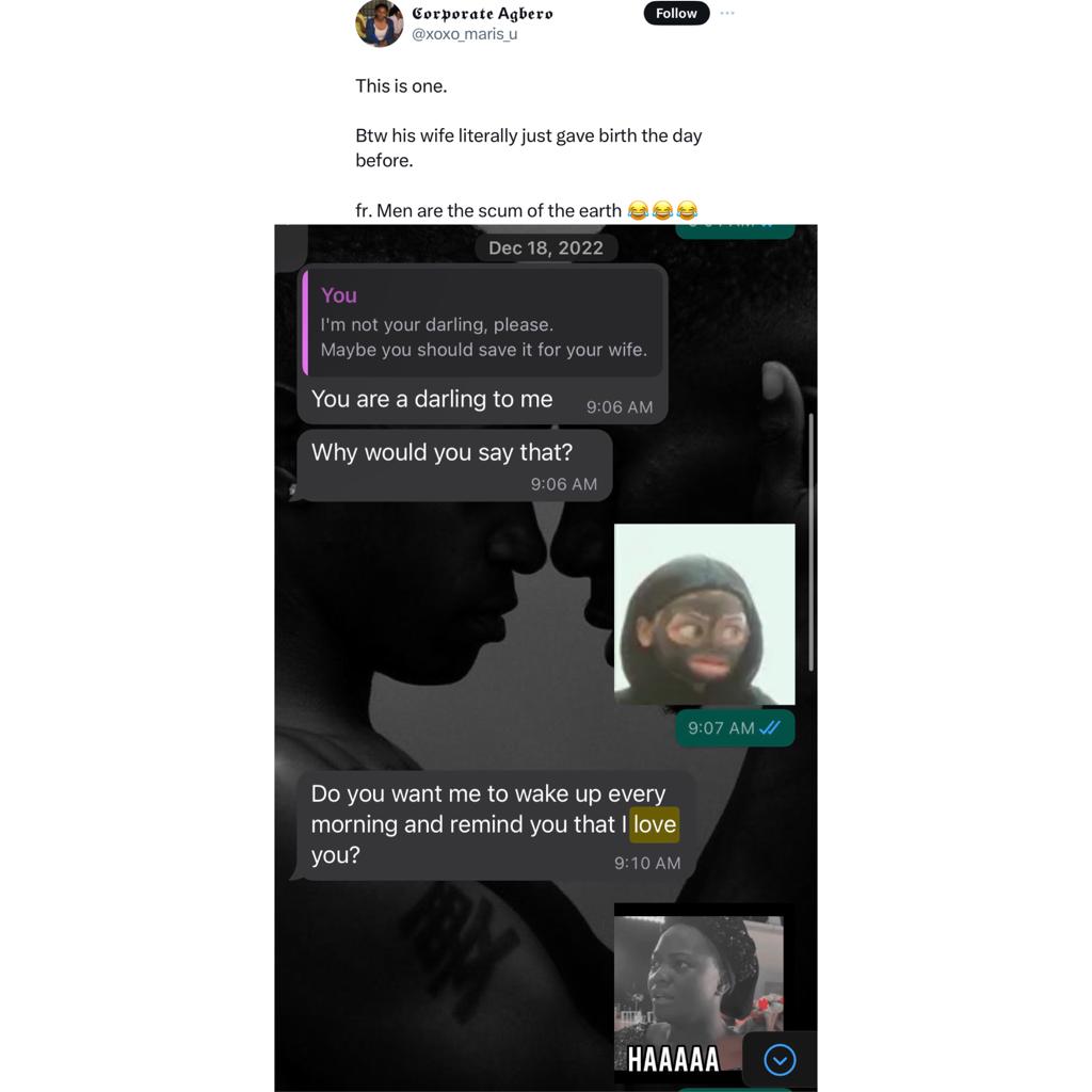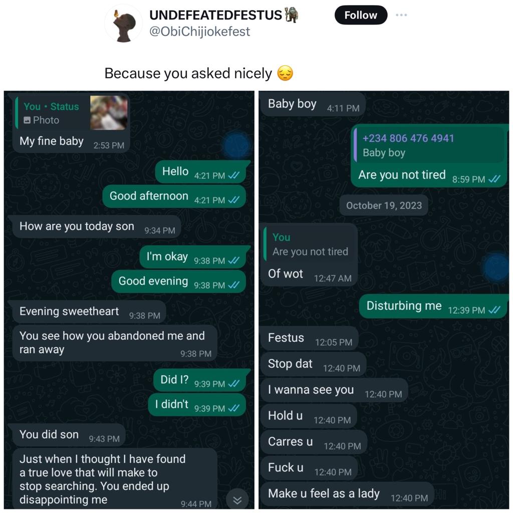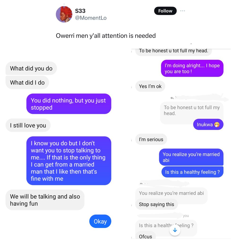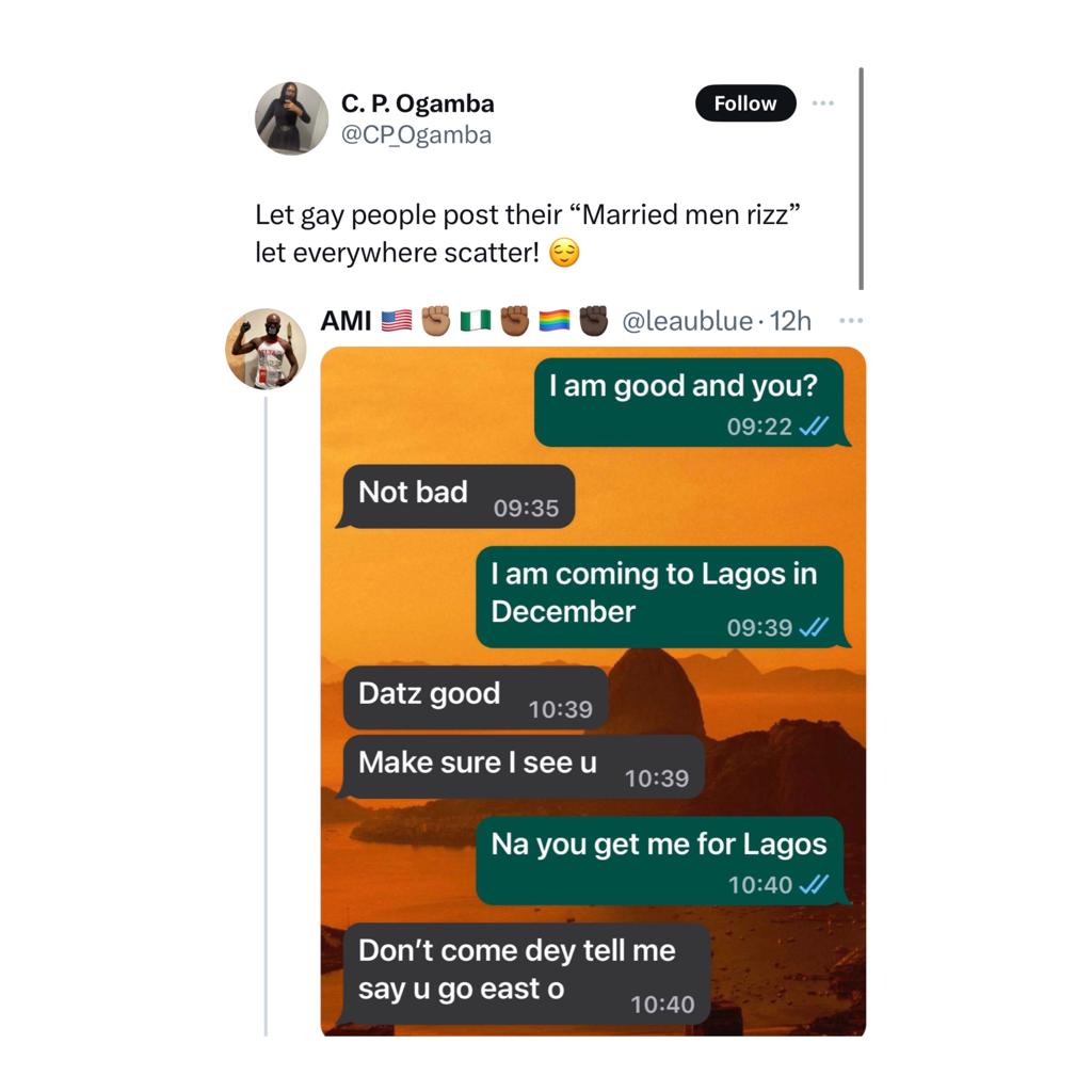 Nigerian gay men have taken to X to share their experiences with Nigerian married men who want a piece of them. They shared their encounter after a Nigerian lady asked gays to come forward with their stories.Some Nigerian gay men saw the post and immediately took to the comment section to share their experiences. One mentioned that he knows the man is married but that he knew him before the man got married and cannot let go. Others shared screenshots of chats with the married men who express their love for them and even dismiss any objection when reminded that they are married. Read their comments below