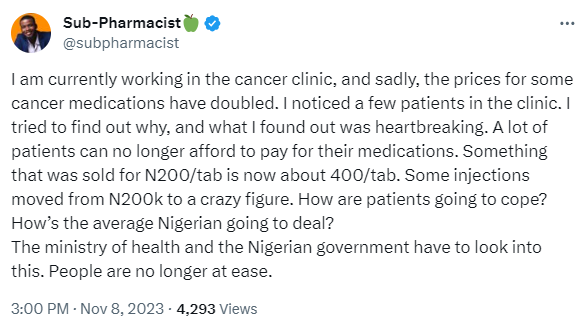 A Nigerian pharmacist has decried the spike in the prices of drugs meant for cancer patients. In a post shared on X, @subpharmacist said he is currently working in a cancer clinic and he has noticed a low turnout of patients. He mentioned that upon inquiry, he discovered that a lot of patients can no longer afford the drugs as most of them have doubled in price. He wrote;I am currently working in the cancer clinic, and sadly, the prices for some cancer medications have doubled. I noticed a few patients in the clinic. I tried to find out why, and what I found out was heartbreaking. A lot of patients can no longer afford to pay for their medications. Something that was sold for N200/tab is now about 400/tab. Some injections moved from N200k to a crazy figure. How are patients going to cope? Hows the average Nigerian going to deal?The Ministry of health and the Nigerian government have to look into this. People are no longer at ease.”The post Some injections moved from N200k to a crazy figure. How are patients going to cope? – Nigerian pharmacists decries spike in drugs for cancer patients appeared first on Linda Ikeji Blog. Click Here to Visit Orignal Source of Article http://www.lindaikejisblog.com/2023/11/some-injections-moved-from-n200k-to-a-crazy-figure-how-are-patients-going-to-cope-nigerian-pharmacists-decries-spike-in-drugs-for-cancer-patients-2.html