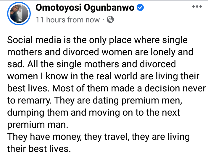 A Nigerian lady, Omotoyosi Ogunbanwo, has addressed men who say single mothers and divorced women are lonely and sad. Social media is the only place where single mothers and divorced women are lonely and sad. All the single mothers and divorced women I know in the real world are living their best lives, she wrote in a Facebook post on Sunday, January 14, 2024. Most of them made a decision never to remarry. They are dating premium men, dumping them and moving on to the next premium man. They have money, they travel, they are living their best lives. But there is you on social media deceived by Allah Kaduna that 33+ women are unwanted. Deceived that divorced women are languishing and suffering waiting for a man to safe them. You will get it into your skull whether you like it or not that women are the prize. And we forever remain the prize. Dont worry sha, when you clock 40+ and make plenty money, a young naive girl will marry you. Then dump you 10 years later to remarry. Like others before you, you must learn a lesson.
