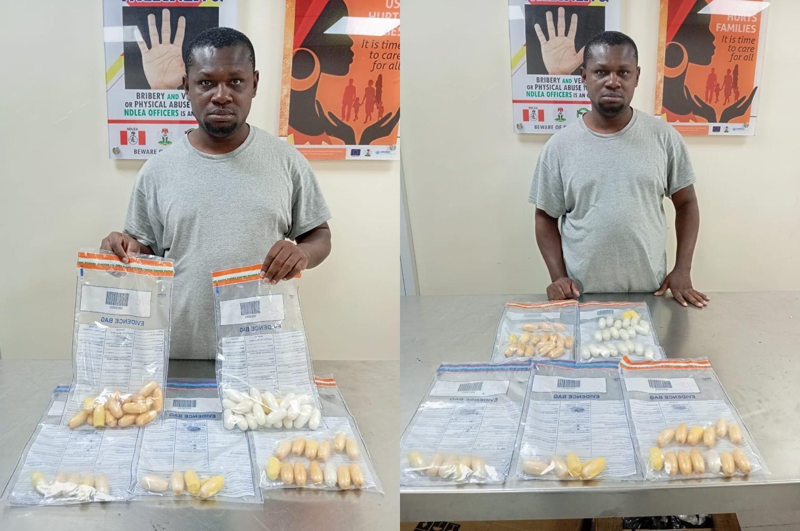 Operatives of the National Drug Law Enforcement Agency, NDLEA, have arrested a Brazil returnee, Udechukwu Ekene Theophilus at the Murtala Muhammed International Airport, MMIA Ikeja Lagos for ingesting 60 big wraps of cocaine. The suspect who was arrested during inward clearance of passengers on Ethiopian Airlines flight from Sao Paulo, Brazil via Addis Ababa, Ethiopia at the D-Arrival Hall of the Lagos airport on Sunday 21st January 2024, initially refused to undergo body scan, raising health concerns in a desperate bid to evade arrest. When he was however offered other options, he accepted to be placed on excretion observation and shortly after he was ushered into NDLEA observatory, he excreted the first set of cocaine pellets, after which he expelled a total of 60 wraps of the class A drug weighing 1.279 kilograms in five excretions. In his statement, Udechukwu claimed he ingested the consignment in Brazil and was to discharge everything at the airport in Addis Ababa but could only excrete 15 pellets which he handed over to another member of his syndicate before his connecting flight to Nigeria was called.