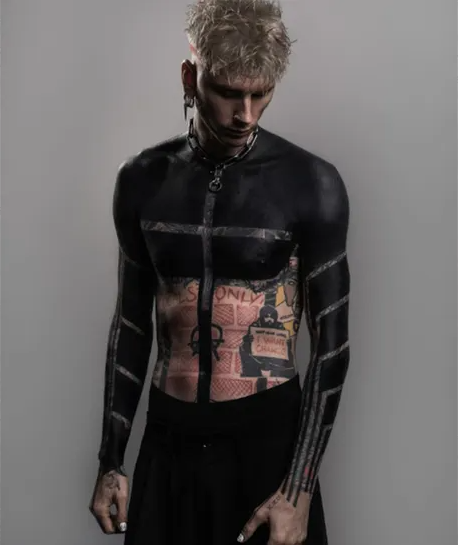 Machine Gun Kelly has unveiled his most dramatic tattoo yet. The rapper got a layer of solid black ink across almost his entire upper torso and the tattoo happens to be real. He shared a photo of his new look on IG on Tuesday, Feb. 20. The black tattoo covered a number of the previous tattoos he got on his upper torso.