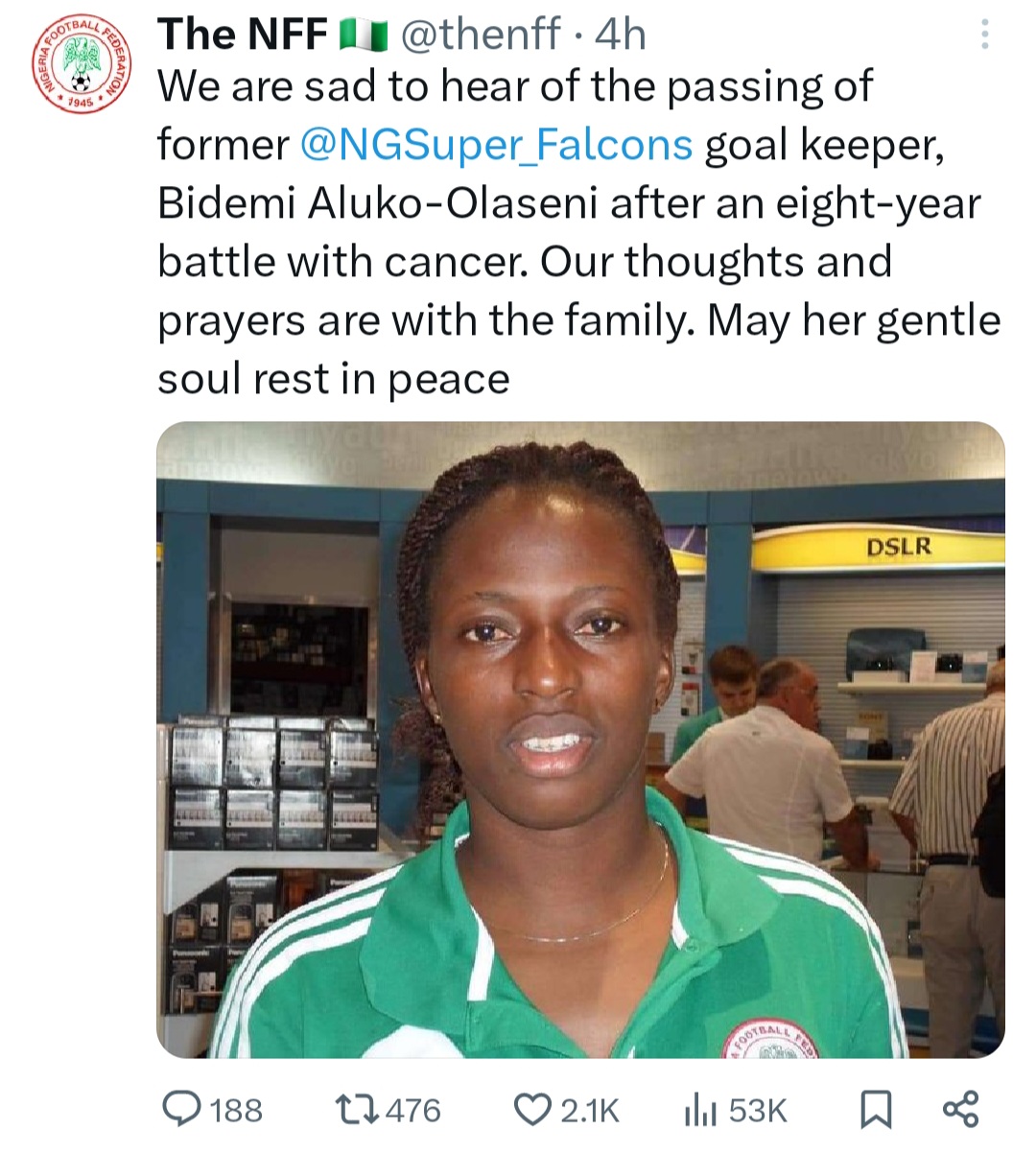 Former Super Falcons goalkeeper, Bidemi Aluko-Olaseni, has passed away after battling with breast cancer for eight years. The Nigeria Football Federation (NFF) confirmed the sad news on their X handle on Saturday. We are sad to hear of the passing of formerSuper Falcons goal keeper, Bidemi Aluko-Olaseni after an eight-year battle with cancer, the NFF wrote. Our thoughts and prayers are with the family. May her gentle soul rest in peace.