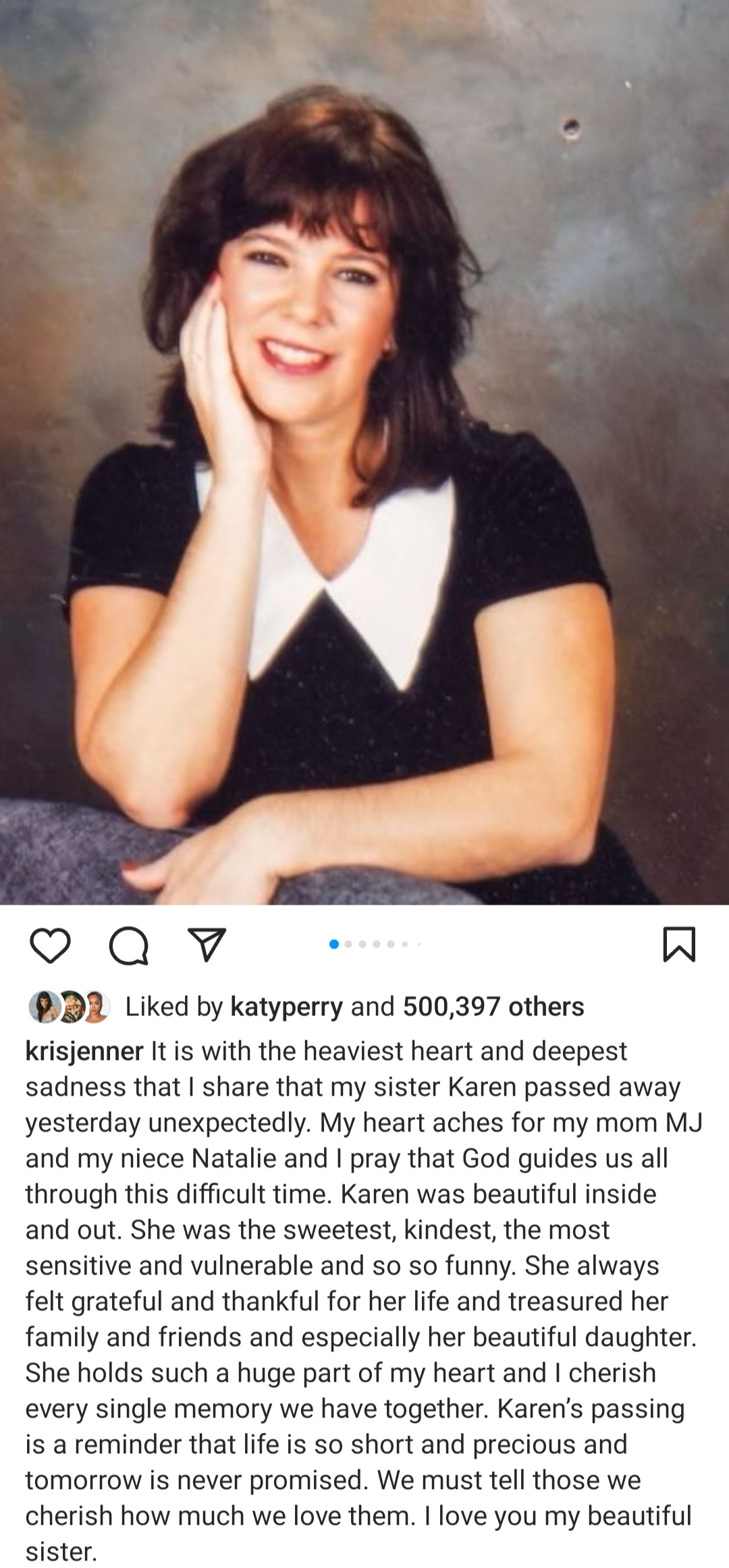 Kris took to social media to address Karen’s death. She shared throwback photos of them together as she mourned her. Kris wrote: “It is with the heaviest heart and deepest sadness that I share that my sister Karen passed away yesterday unexpectedly. My heart aches for my mom MJ and my niece Natalie and I pray that God guides us all through this difficult time. “Karen was beautiful inside and out. She was the sweetest, kindest, the most sensitive and vulnerable and so so funny. She always felt grateful and thankful for her life and treasured her family and friends and especially her beautiful daughter. She holds such a huge part of my heart and I cherish every single memory we have together. Karens passing is a reminder that life is so short and precious and tomorrow is never promised. We must tell those we cherish how much we love them. I love you my beautiful sister.