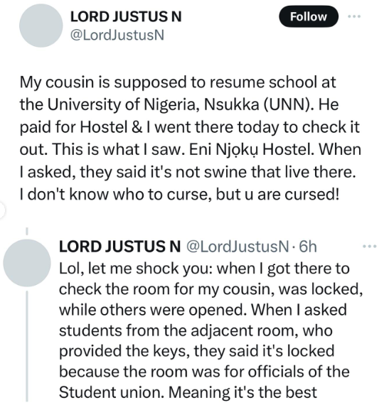 A Nigerian man has shared a video showing the deplorable state of a hostel room in University of Nigeria Nsukka. The man said his cousin, who is to resume in the institution, paid for the accommodation and he decided to pay a visit to the hostel and was stunned by how its state. He wroteMy cousin is supposed to resume school at the University of Nigeria, Nsukka (UNN). He paid for Hostel & I went there today to check it out. This is what I saw. Eni Njk Hostel. When I asked, they said it’s not swine that live there. I don’t know who to curse, but u are cursed!Let me shock you: when I got there to check the room for my cousin, was locked, while others were opened. When I asked students from the adjacent room, who provided the keys, they said it’s locked because the room was for officials of the Student union. Meaning it’s the best”The post Man shares deplorable state of a hostel room in University of Nigeria Nsukka appeared first on Linda Ikeji Blog. Click Here to Visit Orignal Source of Article http://www.lindaikejisblog.com/2024/5/man-shares-deplorable-state-of-a-hostel-room-in-university-of-nigeria-nsukka-2.html
