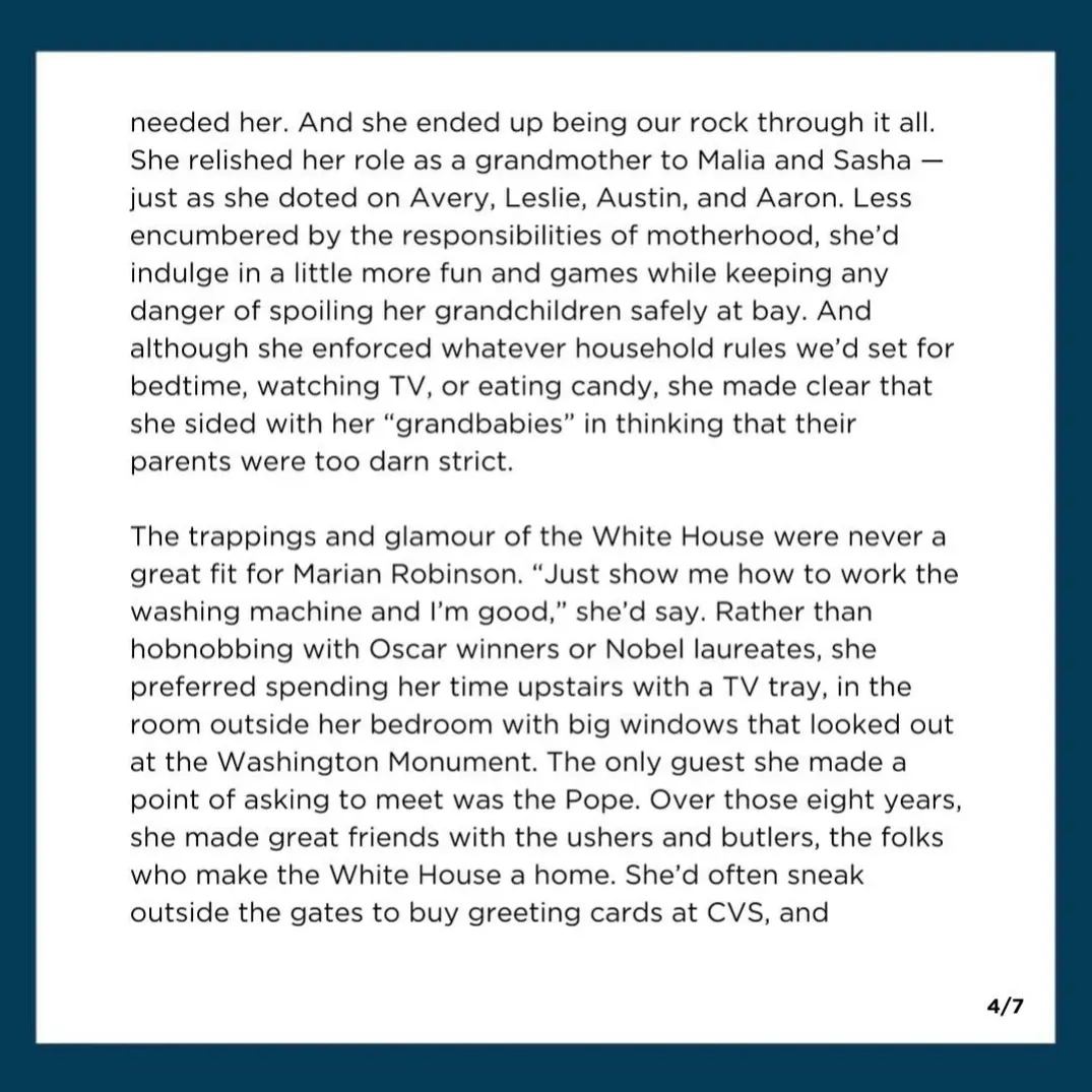 The post Michelle Obama’s mother, Marian Robinson dead at 86 appeared first on Linda Ikeji Blog. Click Here to Visit Orignal Source of Article http://www.lindaikejisblog.com/2024/6/michelle-obamas-mother-marian-robinson-dead-at-86-2.html