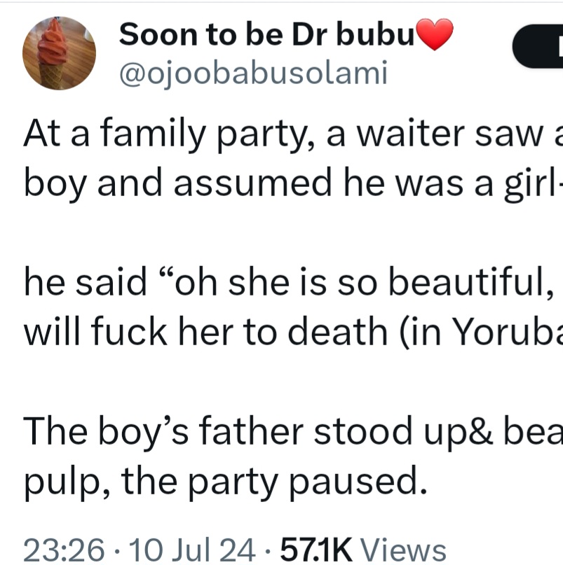 A father dealt with a waiter who made a sxual comment about his 2-year-old son. The incident was narrated on X. She wrote: “At a family party, a waiter saw a 2yr old boy and assumed he was a girl. “He said ‘oh she is so beautiful, but men will fuck her to death (in Yoruba)’ “The boys father stood up& beat him to a pulp, the party paused. She added: “The fact that you saw a child and that was all that came to your mind.   “You should be dealt with, abusers should have no place in our community/ homes.   “Glad the dad stood up for his child. “So vile and disgusting.” The post Boy’s father deals with waiter who sxualised his son after thinking he was a girl appeared first on Linda Ikeji Blog. Click Here to Visit Orignal Source of Article http://www.lindaikejisblog.com/2024/7/boys-father-deals-with-waiter-who-spsxualised-his-son-after-thinking-he-was-a-girl.html