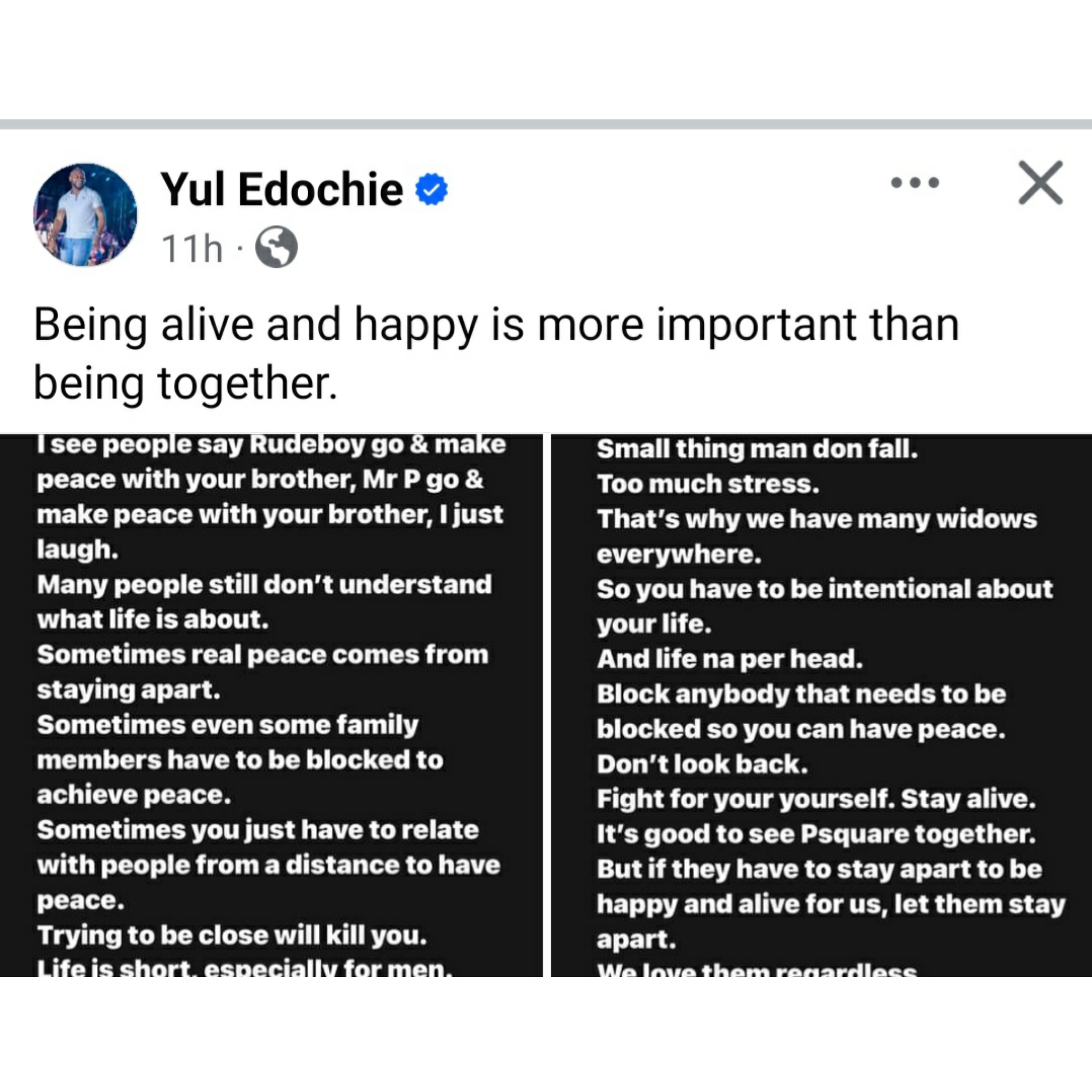 Nollywood actor, Yul Edochie has asked Nigerians to let twin brothers, Peter and Paul Okoye of the now defunct music duo, P-Square, stay apart if they wish. Yul said this while reacting to the ongoing feud between the twin music stars. One half of the group, Paul aka Rudeboy recently announced that P-Square had broken up again for the second time barely three years after they reunited. Paul also spoke about how he was arrested by the EFCC following a petition written against him by his twin brother over his lifestyle. Paul said that while being grilled by the EFCC, he was threatened to the extent of being told that he was going to stay in prison for 20 years. Rudeboy said the EFCC printed out his account statements and presented them as they grilled him. In response, Peter said he has never petitioned the EFCC against his twin brother. He, however, admitted that he filed a petition against their elder brother and former manager, Jude Okoye and his wife Ifeoma Okoye. Peter added that he filed the petition because he discovered that “millions of dollars and hundreds of millions of Naira were being secretly diverted into a secret company’s account, Northside Music allegedly owned by Jude and his wife.Peter further stated that that Jude was then detained after being questioned. He came clean and admitted he had been diverting millions of dollars of our money to his secret company that he and his wife were the directors of. read here and here Following the development, Nigerians, including Peter Obi, have been calling for their reconciliation. Reacting to the issue on Thursday, August 15, Yul stated that having peace of mind sometimes comes from staying apart from some loved ones. See his posts below