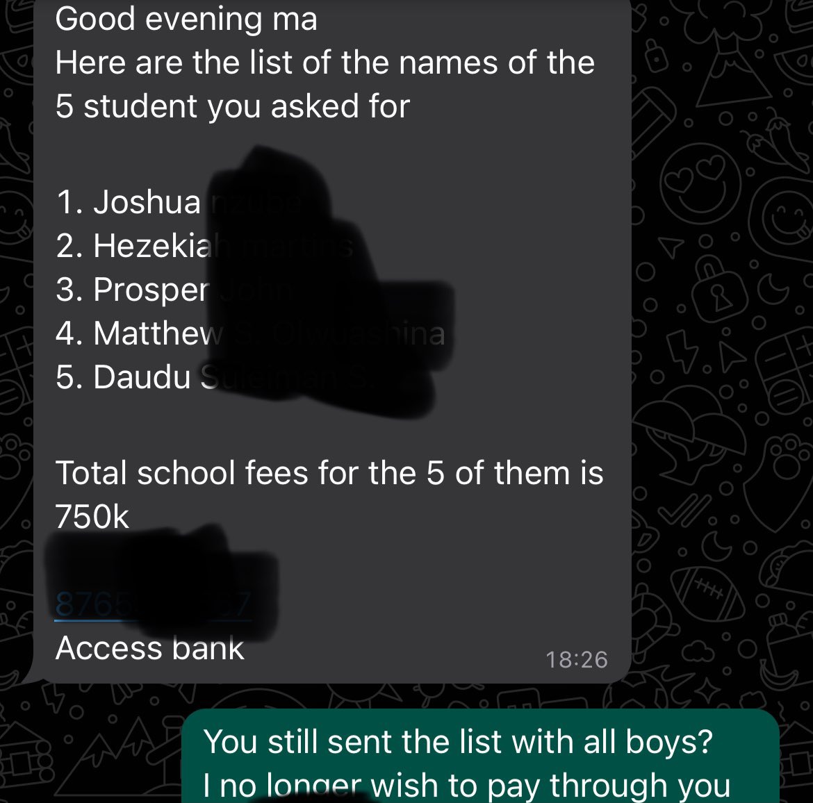 A Good Samaritan who tried to sponsor poor students through school has alleged that she was slut-sh@med by the school principal she approached. The woman wrote on X: “My goodness! just got out of a meeting with a principal to discuss paying fees for someone from JSS3- SS3. “This man brought names of all boys & I asked him if it was an all boys school. “He then goes ‘Ma, if women enter outside them Dey always see who go help them, haha’.” She later shared the names of the prospective beneficiaries that the principal sent to her and they were all boys. She said when she objected to the principal giving the opportunity to only male students, the principal allegedly called her a pr0stitute and told her she got her money from men. Sharing her chat with the principal, she added: “Abeg I no fit laugh this evening. “So he didnt take me seriously during the meeting? this is foking hilarious!!!” She also promised to reach out to the proprietress of the school located in Benin City, Edo State.