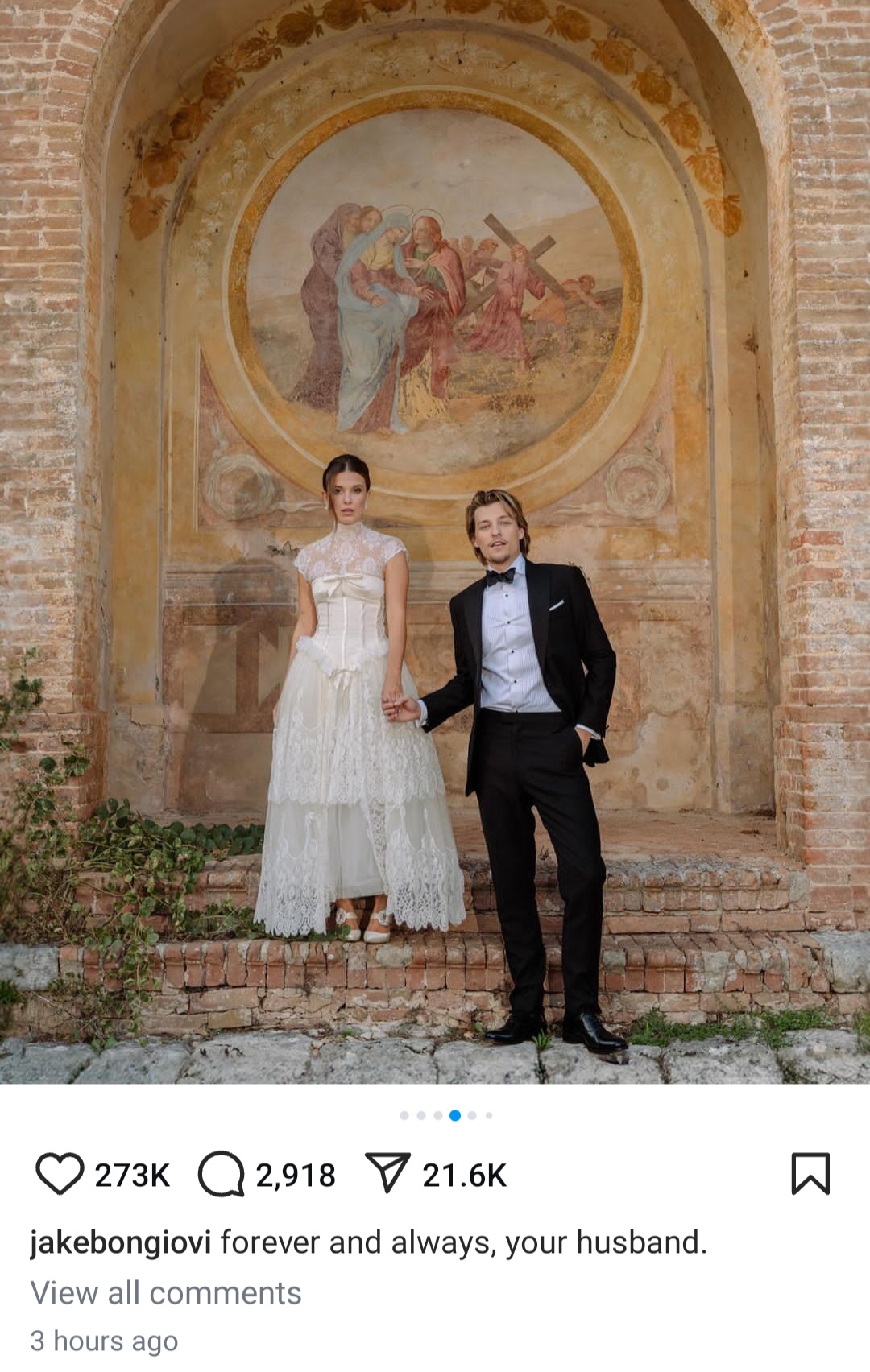Millie Bobby Brown, 20, and Jake Bongiovi, 22, are sharing a glimpse into their dreamy wedding day. After secretly marrying in May, the couple posted photos on Instagram on Wednesday, Oct. 2, from their celebration at Villa Cetinale in Italy with family and friends. “Forever and always, your wife,” the actress captioned the post, which features photos from their wedding.