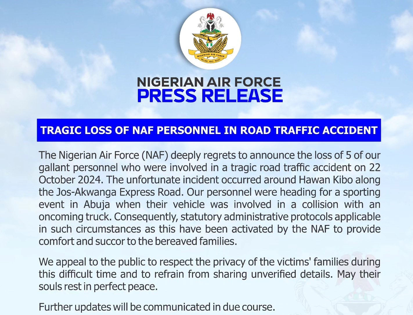 Five personnel of the Nigerian Air Force (NAF) have d!ed in a tragic accident along the Jos-Akwanga Express Road. The unfortunate incident occurred on 22 October 2024. The personnel were heading to Abuja for a sports event when their vehicle collided with an oncoming truck. The Director of Public Relations and Information, NAF, Air Commodore Olusola Akinboyewa, who confirmed the incident in a statement on Tuesday, said efforts had commenced to provide support for the families of the deceased. The Nigerian Air Force deeply regrets to announce the loss of five of our gallant personnel who were involved in a tragic road traffic accident on 22 October 2024, the statement read. The unfortunate incident occurred around Hawan Kibo along the Jos-Akwanga Express Road. “Our personnel were heading for a sporting event in Abuja when their vehicle was involved in a collision with an oncoming truck. Consequently, the statutory administrative protocols applicable in circumstances such as this have been activated by the NAF to provide comfort and support to the bereaved families. “We appeal to the public to respect the privacy of the victims families during this difficult time and to refrain from sharing unverified details. May their souls rest in perfect peace.