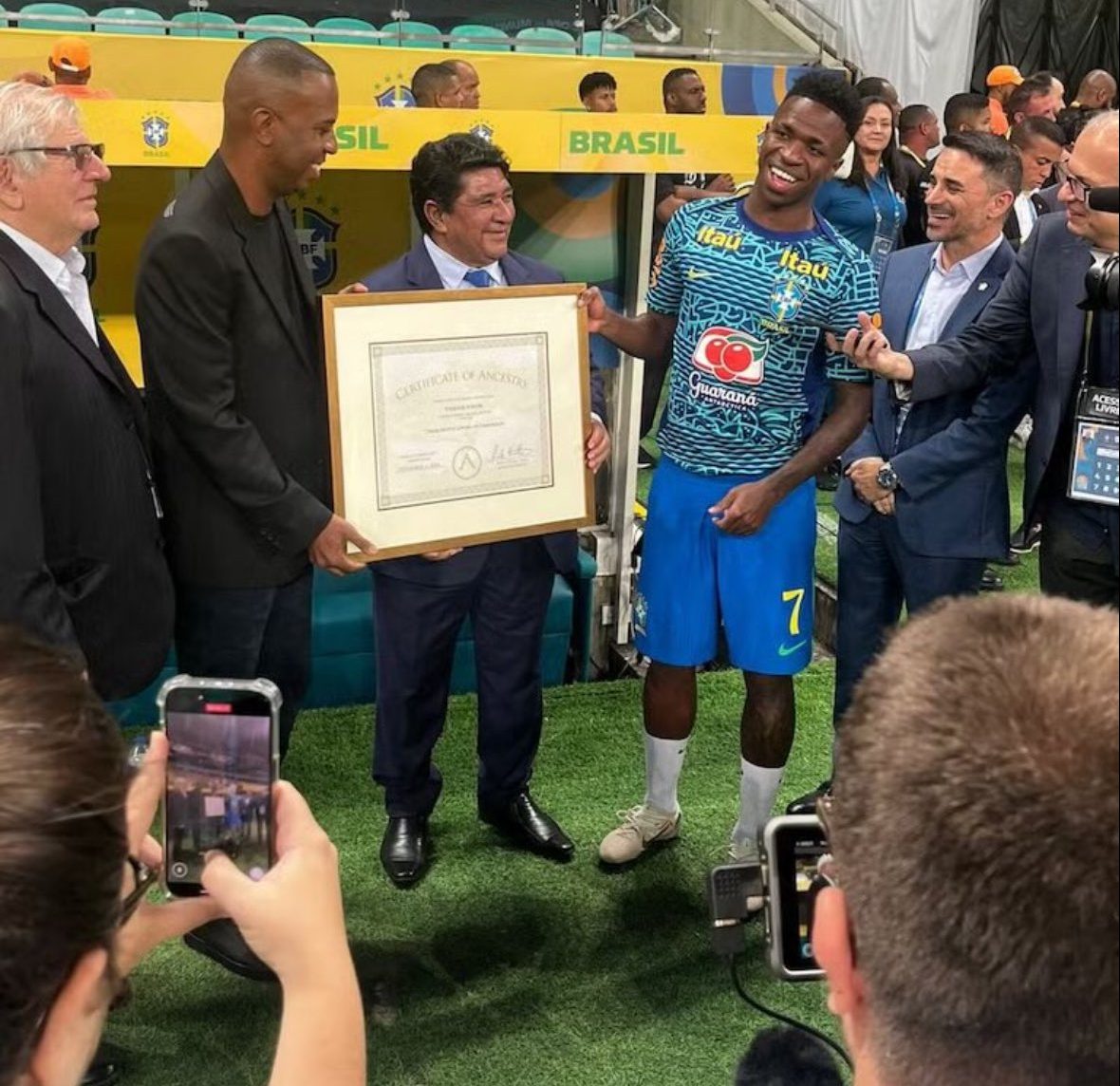 Real Madrid and Brazilian, Vincius Jnior, has discovered his ancestry links to the Tikar tribe in Cameroon following a DNA test conducted by the Brazilian Football Confederation (CBF) in collaboration with AfricanAncestry.com.The test results were unveiled on Tuesday, November 19, 2024, during a ceremony at Fonte Nova, where Vincius was presented with a certificate confirming his heritage.Foot Boom reports that Vincius received the certificate alongside his father, Vincius Jos Paixo de Oliveira, and the president of the CBF, Ednaldo Rodrigues, just before Brazils World Cup qualifier against Uruguay.Speaking at the event, Rodrigues said: To celebrate Vini Jr. is to celebrate the success of all Brazilians. By knowing his origins, we reaffirm our commitment to an inclusive society, recognising the fundamental role of Afro-Brazilian culture in our identity and our success in global football.The founder and president of AfricanAncestry.com, Gina Paige, highlighted the importance of reconnecting individuals of African descent with their roots.Vini Jr. carries within him the desire to honour his heritage. However, like many individuals of African descent, his ancestral story has been erased by racism and the legacy of slavery. Through a DNA test, we discovered that Vini Jr.s ancestors belong to the Tikar tribe in Cameroon. We believe that Vinis reconnection with his African roots is a powerful act of resistance, in line with his advocacy for social justice both on and off the football pitch, Page stated.Reacting to the discovery, Vincius father expressed joy, saying, Its important for us to know where we come from. Many Brazilians dont know their ancestry or heritage. Im happy we are from Cameroon too.The post Real Madrid star, Vincius Jr traces ancestry to Cameroon throughDNAtest appeared first on Linda Ikeji Blog. Click Here to Visit Orignal Source of Article http://www.lindaikejisblog.com/2024/11/real-madrid-star-vinicius-jr-traces-ancestry-to-cameroon-through-dna-test.html