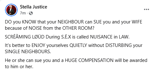An Ebonyi lawyer, Stella, has said that in Nigeria, one can sue their neighbours for if they screamed loudly during s3x intercourse. Do you know that your NEIGHBOUR can SUE you and your WIFE because of NOISE from the OTHER ROOM? SCRMING LD During S..X is called NUISANCE in LAW. It’s better to ENJOY yourselves QUIETLY without DISTURBING your SINGLE NEIGHBOURS. He or she can sue you and a HUGE COMPENSATION will be awarded to him or her,” she wrote. The post Your neighbour can sue you and your wife for noise from the other room’ – Nigerian lawyer says appeared first on Linda Ikeji Blog. Click Here to Visit Orignal Source of Article http://www.lindaikejisblog.com/2024/11/your-neighbour-can-sue-you-and-your-wife-for-noise-from-the-other-room-nigerian-lawyer-says.html