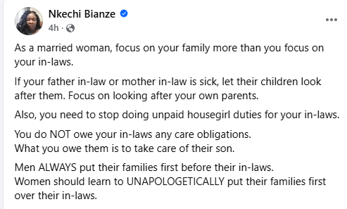 Nigerian feminist, Nkechi Bianze, has advised married women to put their own families and parents first over their in-laws. The mother of two gave the advice on Friday after a man advised men to take care of their parents and siblings more than their in-laws. As a married woman, focus on your family more than you focus on your in-laws, she wrote. If your father in-law or mother in-law is sick, let their children look after them. Focus on looking after your own parents. Also, you need to stop doing unpaid housegirl duties for your in-laws. You do NOT owe your in-laws any care obligations. What you owe them is to take care of their son. Men ALWAYS put their families first before their in-laws. Women should learn to UNAPOLOGETICALLY put their families first over their in-laws.