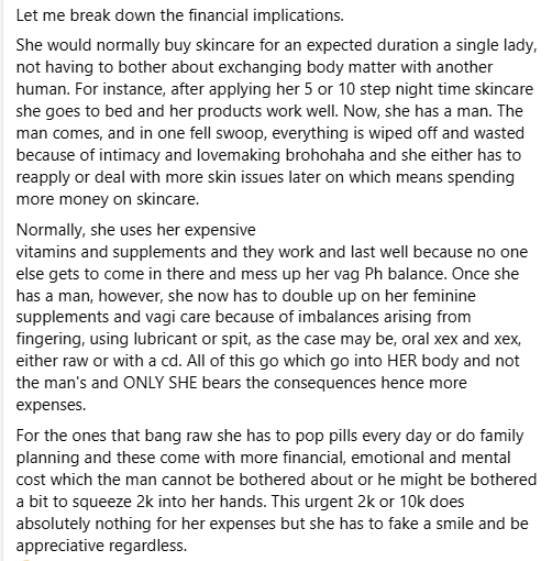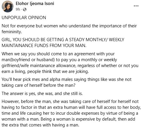 A Nigerian lady, Elohor Ijeoma Isoni, has said that women are entitled to a steady weekly or monthly maintenance funds from their men. Elohor, who stated this in a Facebook post on Thursday said that being in a s3xual relationship comes with financial implications as a woman needs money to take care of her body, double up on her feminine supplements, v@gina care, change lingerie and accessories, including waist beads. UNPOPULAR OPINION Not for everyone but women who understand the importance of their femininity, she wrote. GIRL, YOU SHOULD BE GETTING A STEADY MONTHLY/ WEEKLY MAINTAINANCE FUNDS FROM YOUR MAN. When we say you should come to an agreement with your man(boyfriend or husband) to pay you a monthly or weekly girlfriend/wife maintenance allowance, regardless of whether or not you earn a living, people think that we are joking You’ll hear pick mes and alpha males saying things like was she not taking care of herself before the man? The answer is yes, she was, and she still is. However, before the man, she was taking care of herself for herself not having to factor in that an extra human will have full access to her body, time and life causing her to incur double expenses by virtue of being a woman with a man. Being a woman is expensive by default, then add the extra that comes with having a man. Let me break down the financial implications. She would normally buy skincare for an expected duration a single lady, not having to bother about exchanging body matter with another human. For instance, after applying her 5 or 10 step night time skincare she goes to bed and her products work well. Now, she has a man. The man comes, and in one fell swoop, everything is wiped off and wasted because of intimacy and lovemaking brohohaha and she either has to reapply or deal with more skin issues later on which means spending more money on skincare. Normally, she uses her expensive vitamins and supplements and they work and last well because no one else gets to come in there and mess up her vag Ph balance. Once she has a man, however, she now has to double up on her feminine supplements and vagi care because of imbalances arising from fingering, using lubricant or spit, as the case may be, oral xex and xex, either raw or with a cd. All of this go which go into HER body and not the man’s and ONLY SHE bears the consequences hence more expenses. For the ones that bang raw she has to pop pills every day or do family planning and these come with more financial, emotional and mental cost which the man cannot be bothered about or he might be bothered a bit to squeeze 2k into her hands. This urgent 2k or 10k does absolutely nothing for her expenses but she has to fake a smile and be appreciative regardless. She also has to spend more on lingerie and feminine clothing and accessories because waist beads get cut every week, and panties get tore off. She’s supposed to bear all these extra financial implications alone while being an understanding girlfriend Feminine washes and toiletries get replaced every 2 weeks instead of every month because she has to clean up after every round for her optimum personal hygiene and to also be fresh for her partner while the man just moves on with his life. At the end of the day, she’s spending so much more just by virtue of being a woman that has a man, and all he contributes is what exactly? Love, care? What’s all that without money? Honey, ultimately, he’s attracted to you and approached you because you look and smell so good and that costs manayyy. He wouldn’t have approached you if the reverse was the case. So if he’s going to benefit from all that then he’s got to keep watering you by spending on you so that you can maintain all that goodness, and how else is he going to do that? Words of affirmation? The only TANGIBLE thing has to be MONEY. That’s the only commensurate thing, not I love you. So do your calculations and ask him for monthly girlfriend/wife allowance today. It’s your right. And no, this doesn’t exempt him from buying you gifts and providing for the household. This is my unpopular opinion.