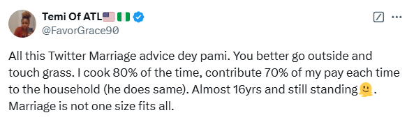A US-based Nigerian registered nurse, Temi, who has been married for 16 years revealed that she cooks 80% of the time and contributes 70% of her salary to the household. She wrote this in response to marriage advice being shared on Twitter. All this Twitter Marriage advice dey pami. You better go outside and touch grass. I cook 80% of the time, contribute 70% of my pay each time to the household (he does same). Almost 16yrs and still standing. Marriage is not one size fits all, she wrote on X on Sunday, December 29.