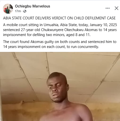 A mobile court sitting in Umuahia, Abia State, has sentenced a 27-year-old man, Chukwunyere Okechukwu Akomas, to 14 years imprisonment for def!ling two minors, aged 8 and 11. Akomas was sentenced on Friday, January 10, 2025. The court found Akomas guilty on both counts and sentenced him to 14 years imprisonment on each count, to run concurrently. Human rights activist and coordinator of Behind Bar Foundation, Abia State chapter, disclosed this on Friday night.