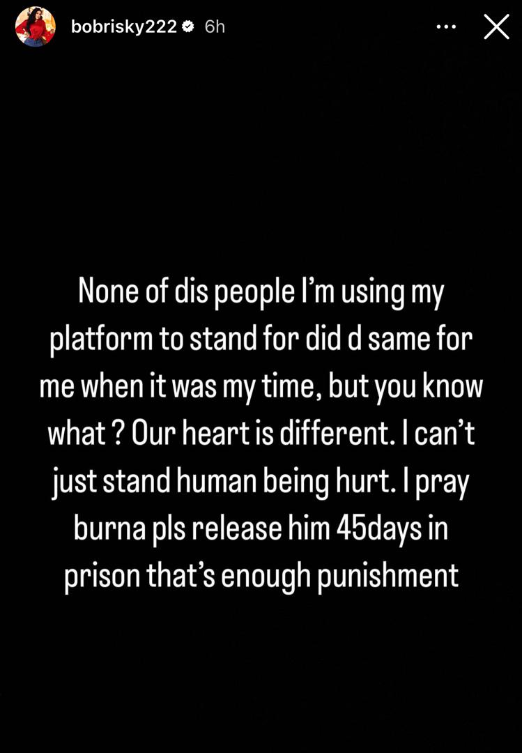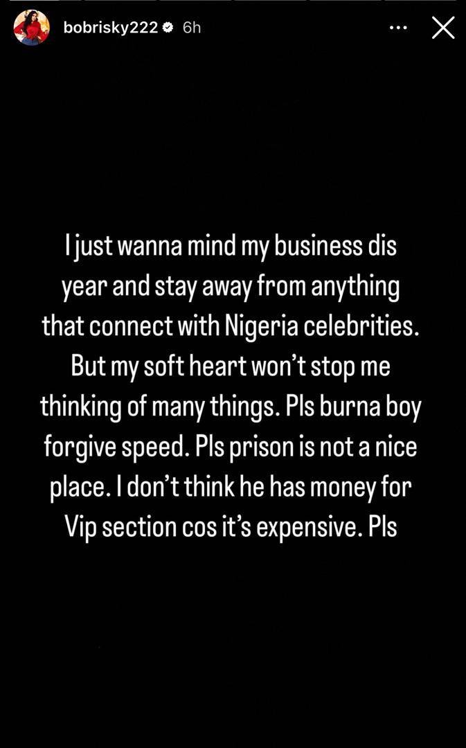 Crossdresser, Bobrisky, has appealed to singer, BurnaBoy, to effect the release of singer Speed Darlington. Speed Darlington has been in police custody since November 27 after he was arrested for jumping bail in an ongoing investigation into a petition filed against him by his colleague, Burna Boy. In a post shared on Instagram, Bobrisky said prison is not nice place and that he knows Speed Darlington doesn’t have money to secure a place in the VIP section because it is quite expensive.