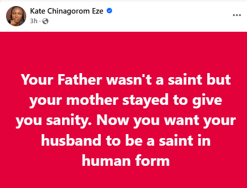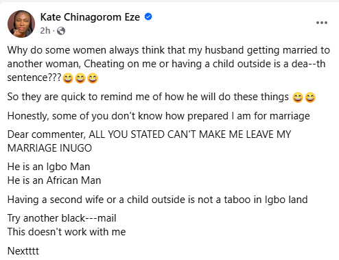 A Nigerian woman, Kate Chinagorom Eze, has said she won’t leave her husband if he takes another wife, cheats on her or gets a child outside their marriage. She stated this in a Facebook post on Thursday, January 16, while responding to people criticising her after she gushed about her beautiful marriage while taking a dig at women who leave their marriages over infidelity and other marital conflicts. Why do some women always think that my husband getting married to another woman, cheating on me or having a child outside is a dea–th sentence??, she wrote. “So they are quick to remind me of how he will do these things “Honestly, some of you don’t know how prepared I am for marriage “Dear commenter, ALL YOU STATED CAN’T MAKE ME LEAVE MY MARRIAGE INUGO “He is an Igbo Man. He is an African Man “Having a second wife or a child outside is not a taboo in Igbo land Try another blackmail. This doesn’t work with me.