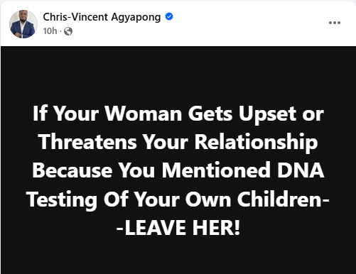 A Ghanaian lawyer, Chris Vincent Agyapong has advised men to end relationship with any woman who gets upset at the mention of conducting DNA test on their children. The post If your woman threatens your relationship because you mentioned DNA test, leave her – Ghanaian lawyer advises men appeared first on Linda Ikeji Blog. Click Here to Visit Orignal Source of Article http://www.lindaikejisblog.com/2025/1/if-your-woman-threatens-your-relationship-because-you-mentioned-dna-test-leave-her-ghanaian-lawyer-advises-men.html
