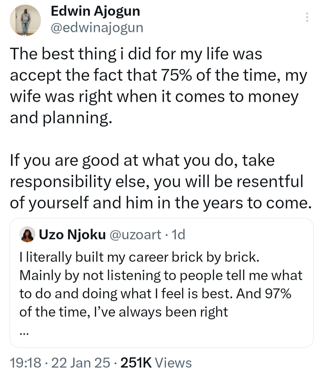 The man replied, asking why she needs a man to lead her when she’s educated and capable. The man then shared that the best thing he did for his life was to accept that his wife was right most of the time and defer to her. He then added that if he were a woman, he would be depressed due to the expectation that women should live a life of servitude to men because of their gender. He also added that he will never understand the women who want to be led. See his tweets below.