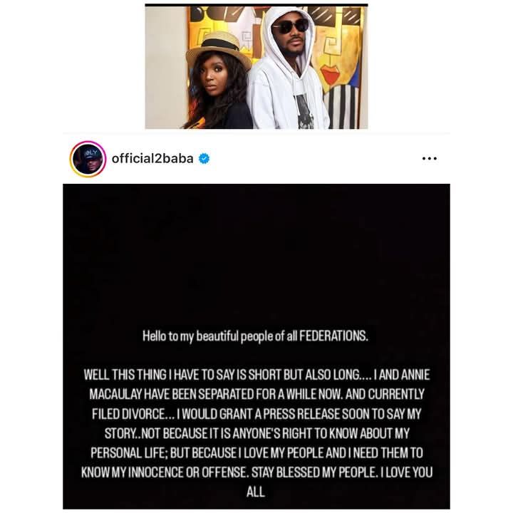 Nigerian music icon 2face Idibia, also known as 2Baba, has officially announced his separation from wife Annie Macaulay-Idibia. The artist took to social media to reveal that the couple had been living apart for some time, and divorce proceedings are now in motion.