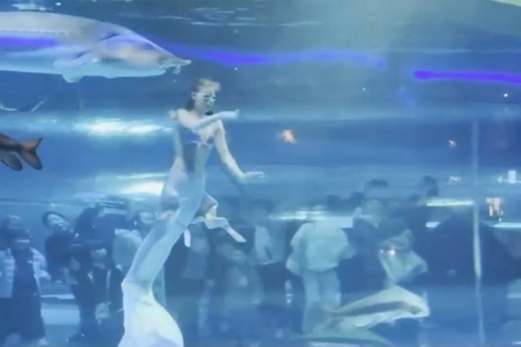 Terrifying footage captured the moment a huge fish clamped its jaws down a woman dressed as a mermaid as she performed underwater for children at a Chinese aquarium. The Russian aquatic artist, identified only as Masha, was swimming in a tank at the Xishuangbanna Primitive Forest Park in southern China on Tuesday, Jan. 28, when she swam in the path of the fish.