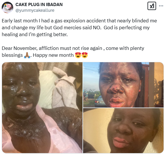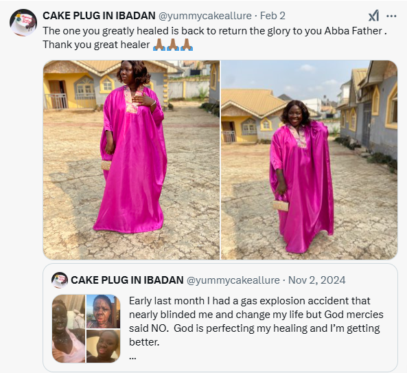 A Nigerian woman has shared her story of recovery a few months after she survived a gas explosion. The baker, in a post via X on Sunday, February 2, 2025, shared new photos of herself, thanking God for her healing. According to her, the incident which occurred in October 2024 nearly left her blind. The one you greatly healed is back to return the glory to you Abba Father. Thank you great healer, captioned the post.