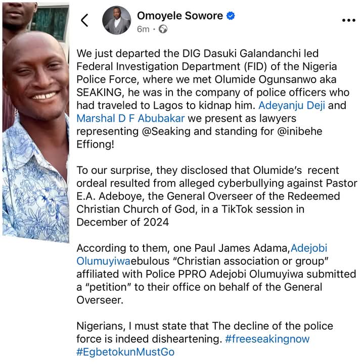 Nigerian NewsTikToker Seaking Rearrested for Alleged Defamatory Comments Against Pastor Adeboye – Sowore by WMtvFebruary 7, 2025February 7, 2025078 Share0