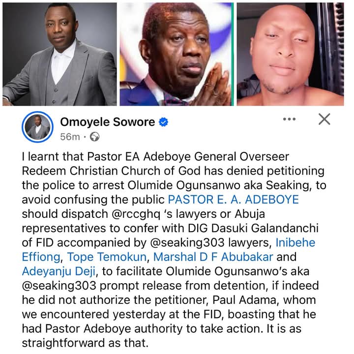 Nigerian NewsSowore Challenges Pastor Adeboye to ‘Secure Seaking’s Release to Prove No Involvement in Arrest by WMtvFebruary 9, 2025February 9, 20250101 Share0