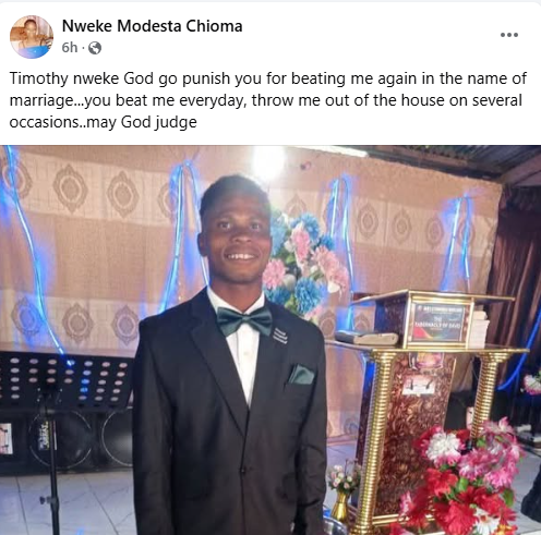 A Nigerian woman, Nweke Modesta Chioma has called out her husband, Timothy Nweke and his evangelist side chick. In a Facebook post on Sunday, February 9, she claimed that her husband beat and r3ped her after she confronted him for bringing his alleged side chic to their matrimonial bed. Timothy nweke God go punish you for beating me again in the name of marriage…you beat me everyday, throw me out of the house on several occasions.., may God judge, she wrote. “You claim to be a pastor but always bring church girls in our matrimonial bed and when I try to confront youyou beat me up and rape me afterwards. Sharing a photo of the alleged side chick, she claimed her to stay away from her husband. Here is the lady that has vow that I won’t have peace in my home, my husband side chic…. please leave my husband alone. I won’t hide anything again. I Will show the world your face. You claim to be evangelist but sleeping with my husband…Christ holy church see una evangelist husband snatcher, she added.