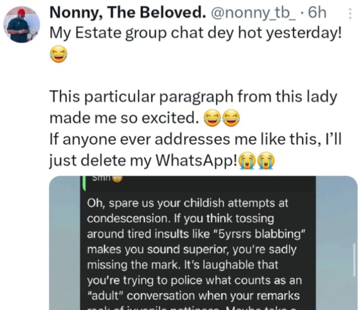 A man has shared the messages exchanged on his estate’s WhatsApp group. Chats between estate residents got heated when an older resident shamed another for their comment. “Who is this 5 years old blabbing while adults are having conversations Biko???Smh,” an older estate resident wrote. But another estate resident hit back with scathing words that shocked the group. The X user who shared the screenshot revealed that he would delete WhatsApp if he was the one spoken to that way. See below.
