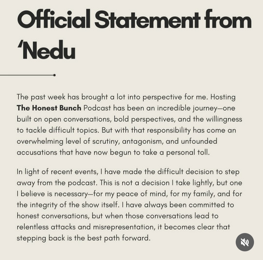 On Air Personality, Chinedu Ani Emmanuel popularly known as Nedu Wazobia has stepped down as one of the hosts of the popular online show, Honest Brunch Podcast after being dragged continuously, by social critic, Martins Otse aka VeryDarkMan. It all started after Nedu invited Deeone to the show where the BBN star claimed VDM was into men and had allegedly collected money from men for s3x. Reacting to the podcast, VeryDarkMan called out Nedu on his page, claiming the media personality invited Deeone to the show on purpose, to criticise him. VDM directed his att@ck on Nedu, spilling several “secrets” the OAP allegedly told him in confidence, including the women he had allegedly slept with. He also dared Nedu to deny it. Some of the women whose names were mentioned shared several videos to debunk VDM’s claims of having any relationship with Nedu aside from professional. Reacting to the uproar, Nedu has decided to step away from the podcast for his “peace of mind, family and the integrity of the show itself.” He shared a statement on his social media pages regarding his decision to quit the show.He wrote;Official Statement from Nedu WazobiaThe past week has brought a lot into perspective for me. Hosting The Honest Bunch Podcast has been an incredible journeyone built on open conversations, bold perspectives, and the willingness to tackle difficult topics. But with that responsibility has come an overwhelming level of scrutiny, antagonism, and unfounded accusations that have now begun to take a personal toll.In light of recent events, I have made the difficult decision to step away from the podcast. This is not a decision I take lightly, but one I believe is necessaryfor my peace of mind, for my family, and for the integrity of the show itself. I have always been committed to honest conversations, but when those conversations lead to relentless attacks and misrepresentation, it becomes clear that stepping back is the best path forward.I sincerely hope this decision brings an end to the negativity surrounding my name and allows The Honest Bunch Podcast to continue thriving. I remain committed to fostering dialogue in ways that encourage meaningful engagement and growth, and I look forward to new opportunities that align with that vision.I wish the show continued success and thank everyone who has supported me throughout this journey.