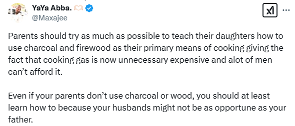 A Nigerian man, Yaya Abba, has advised parents to teach their daughters how to use charcoal and firewood because their future husbands might not afford cooking gas. “Parents should try as much as possible to teach their daughters how to use charcoal and firewood as their primary means of cooking giving the fact that cooking gas is now unnecessary expensive and a lot of men cant afford it. Even if your parents dont use charcoal or wood, you should at least learn how to because your husbands might not be as opportune as your father, he wrote.