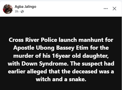 The Cross River State Police Command has allegedly launched a manhunt for a pastor, Apostle Ubong Bassey, over the d3ath of his 16-year-old daughter, Deborah, accused of witchcraft. According to Journalist, Agba Jalingo, who confirmed the incident on Thursday, February 20, Deborah, who had Down Syndrome, was allegedly accused of being a witch and snake by her father. The incident, which took place on Saturday 15 February 2025 at about 4pm at No. 7 Jacob Street off Eyo Edem, Calabar South Local Government Area of the state, left neighbours in shock. The deceased’s brother, Master Bassey narrated to the police how the sister d!ed, saying that at around 4pm, he went to open the door where his sister was locked up to assist her dispose of her faeces. But his father insisted she disposed of it herself. She did and, on her way back to the room, slipped and fell on the floor. Bassey called on their father, Apostle Ubong who, on entering the room, asked him to leave while he attended to her. The children were shocked when, after a long while, their father called them into the room and announced to them that their elder sister had passed on. According to Apostle Ubongs estranged wife who had been locked in custody with the suspect, over their 3 children, this was not the first act of violence. We (mother and children including the deceased) have suffered severe physical abuses leading to my running away, she narrated even as she never gave up the struggle to liberate her kids. She called on well-meaning Nigerians to ensure her daughter gets justice. We thank Women Arise, UNICAL, Project Alert, Etinosa Yvonne, Gary Foxcroft, Basic Rights Counsel Initiative, Safe Child Africa and James Ibor for their support to help our family stay safe while the Police carry on their investigations,” she said. The post Cross River police allegedly launch manhunt for pastor over d3ath of his 16-year old daughter with Down Syndrome appeared first on Linda Ikeji Blog. Click Here to Visit Orignal Source of Article http://www.lindaikejisblog.com/2025/2/cross-river-police-allegedly-launch-manhunt-for-pastor-over-d3ath-of-his-16-year-old-daughter-with-down-syndrome.html