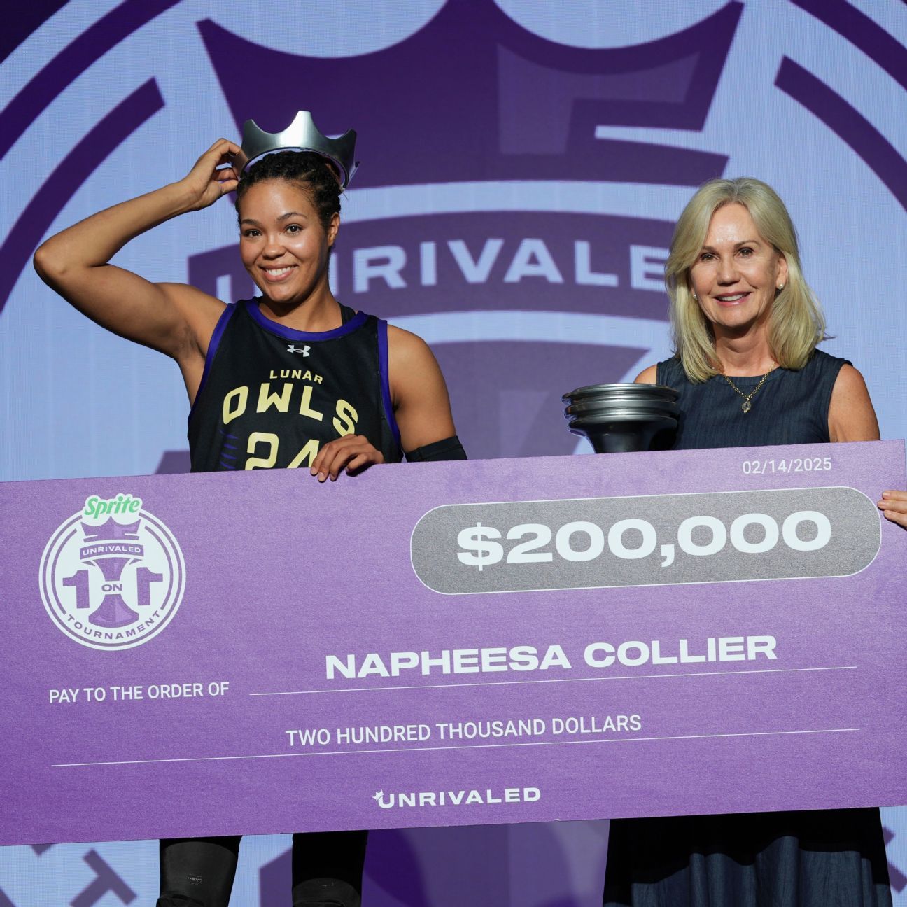 Unrivaled co-founder and player Napheesa Collier is giving $100,000 — half of her prize money for winning the league’s first one-on-one tournament — to her training and performance staff and assistant coaches working with her team, the Lunar Owls, sources told ESPN on Friday.